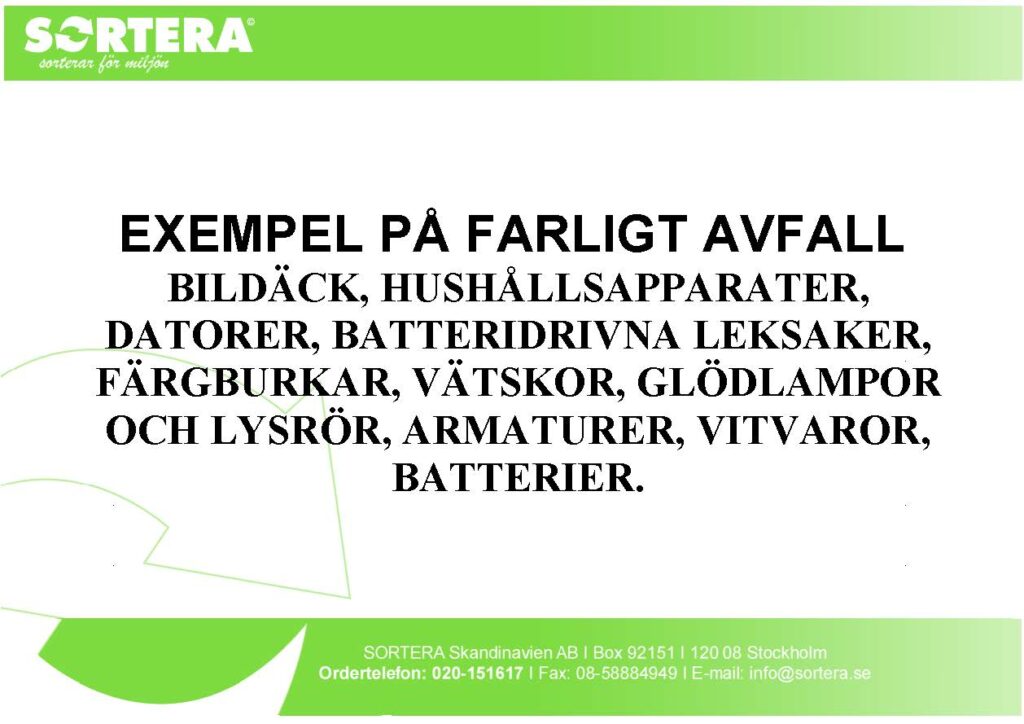 I containern kan ni slänga det mesta (till exempel blandat glas, plast, metall, trä) bortsett från däck, elavfall och farligt avfall (t ex batterier, färgburkar, glödlampor). Klicka här för sorteringsguide och här för information om farligt avfall. Om det slängs i farligt avfall, elavfall eller däck kommer föreningen debiteras extrakostnad.